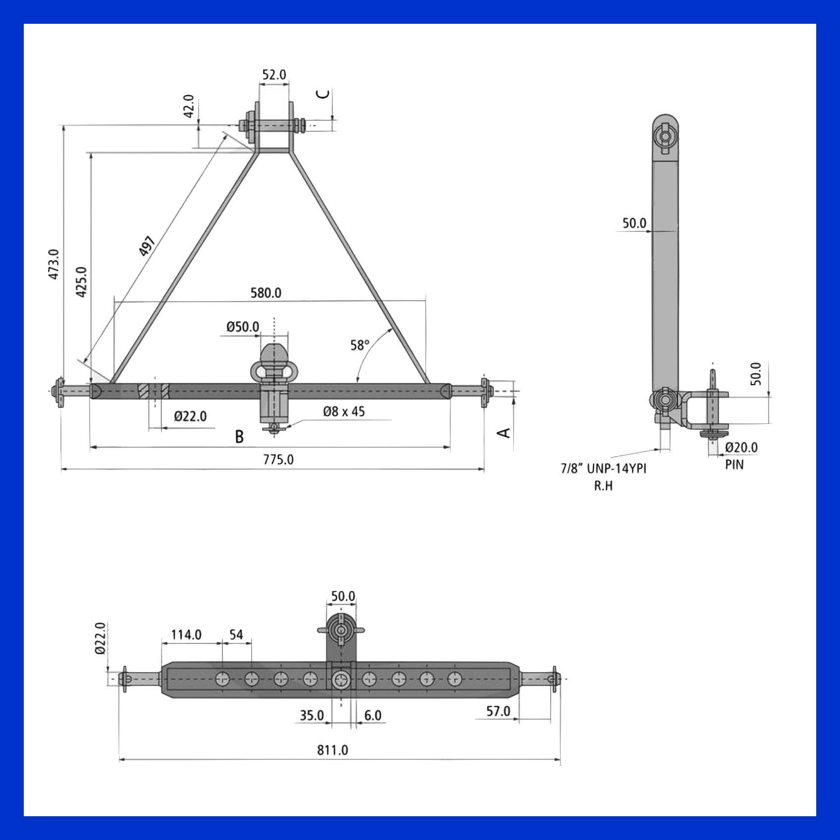 Anhängekupplung für Dreipunkt KAT 1 - 775mm Kugelkopf und Zugmaul Ackerschiene